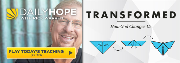 | | | | | | | Our Gift: TRANSFORMED Study Kit A 7-session DVD and workbook that will explore what the Bible has to say about EVERY area of your life: Spiritual, Physical, Mental, Emotional, Relational, Financial, and Vocational. MORE | | | | | | | | | | | | | This devotional is based on the current Daily Hope radio series at www.rickwarren.org. Rick Warren has helped people live with hope and on purpose for more than 40 years. He’s the founding pastor of Saddleback Church in Southern California and author of several books, including “The Purpose Driven Church” and “The Purpose Driven Life,” read by more than 100 million people in 137 languages. He created the PEACE Plan (plant churches of reconciliation, equip servant leaders, assist the poor, care for the sick, educate the next generation), which is used by churches in 196 countries. His radio teaching and daily devotional, Daily Hope, is offered across America. | | | Follow Us: | | Follow Pastor Rick on Facebook and Twitter. | | | Enjoy today’s devotional? Listen instantly to the full radio message at Daily Hope Radio. Did someone forward this Daily Devotional to you? Get your own free subscription to The Purpose Driven Connection Daily Devotional, your daily inspiration via email. | | | This devotional © 2015 by Rick Warren. All rights reserved. Used by permission. | | |